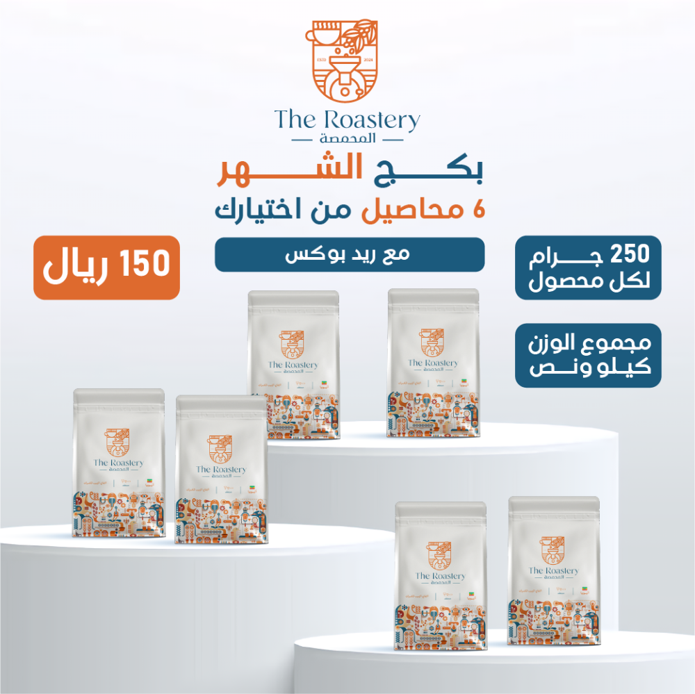استمتع بتجربة فريدة مع بكج الشهر الذي يضم 6 محاصيل مختصة، كل منها بوزن 250 جرام، لتصل إلى إجمالي 1.5 كيلو من القهوة المميزة.