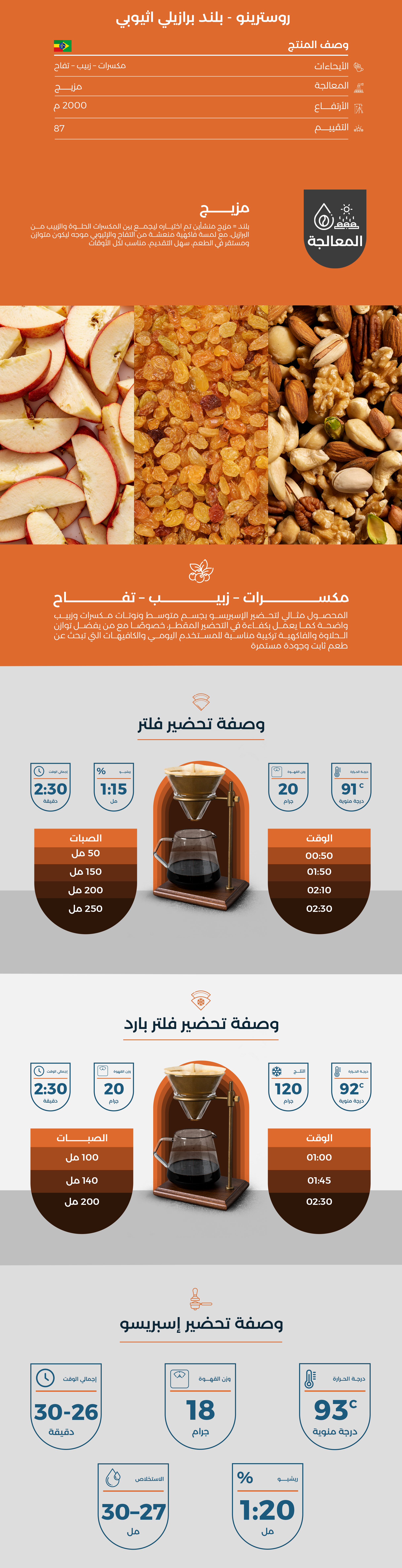 قهوة روسترينو ببلند برازيلي–إثيوبي فريدة من نوعها، تمزج بين حلاوة الفواكه و دفء المكسرات لتمنحك كوبًا متوازنًا يناسب كل الأوقات.